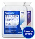 RecoverUp® Immune Support 24h™ is a next generation, 2-part nutritional food supplement with separate AM and PM capsules. It contains an advanced stack of 33 active ingredients (including 100% plant powered bioactives, vitamins, minerals and a live culture) that are scientifically proven to support the body in 10 different ways.